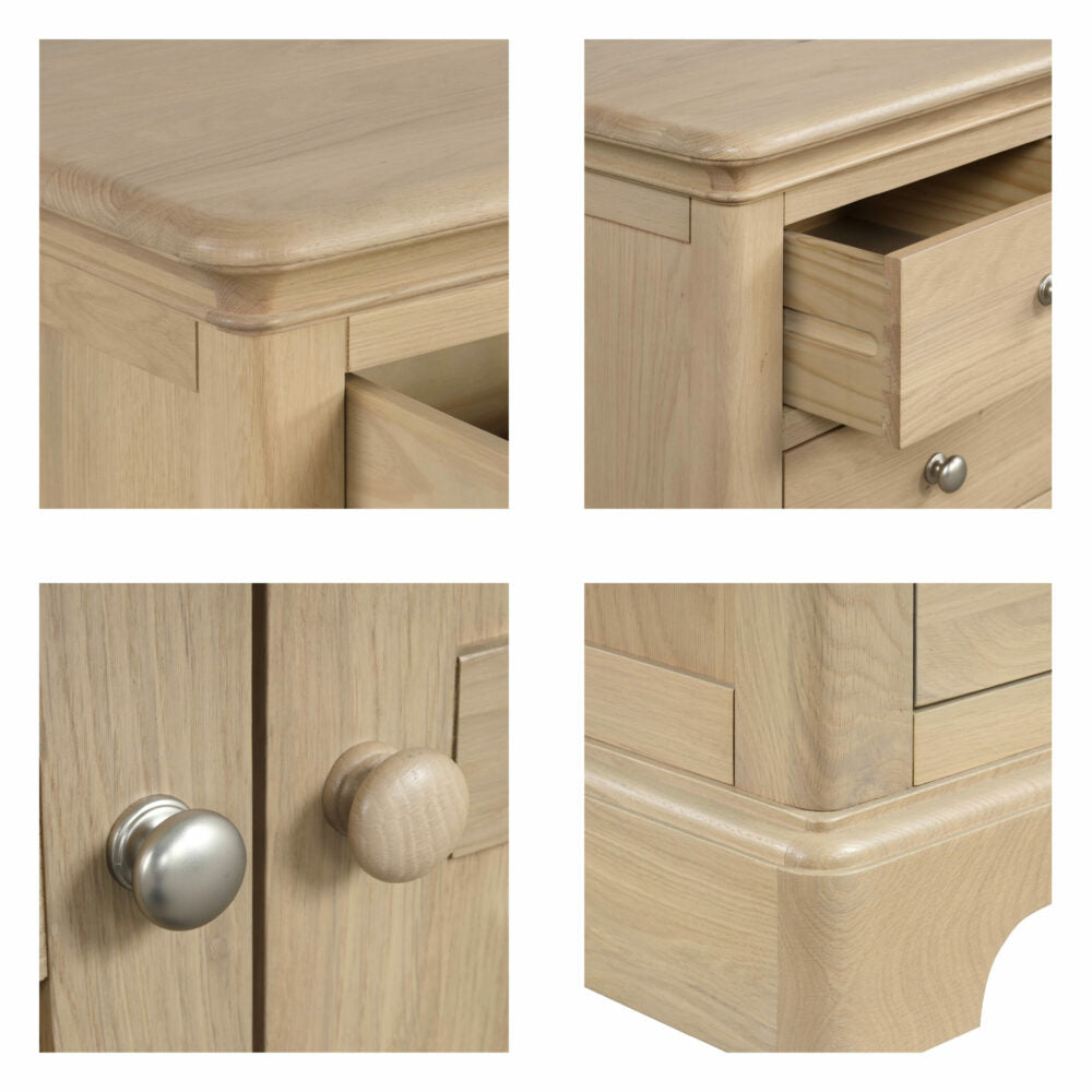 This Lyon Oak 2 Drawer Bedside Table boasts durable storage and surface space for books, glasses, smartphones, and more. Its curved edges, rounded tops, sculptured plinths, and light oak finish provide a modern touch to any bedroom. Additionally, this table has been crafted with high-quality materials and meticulous attention to detail. Truly a must-have for any bedroom.