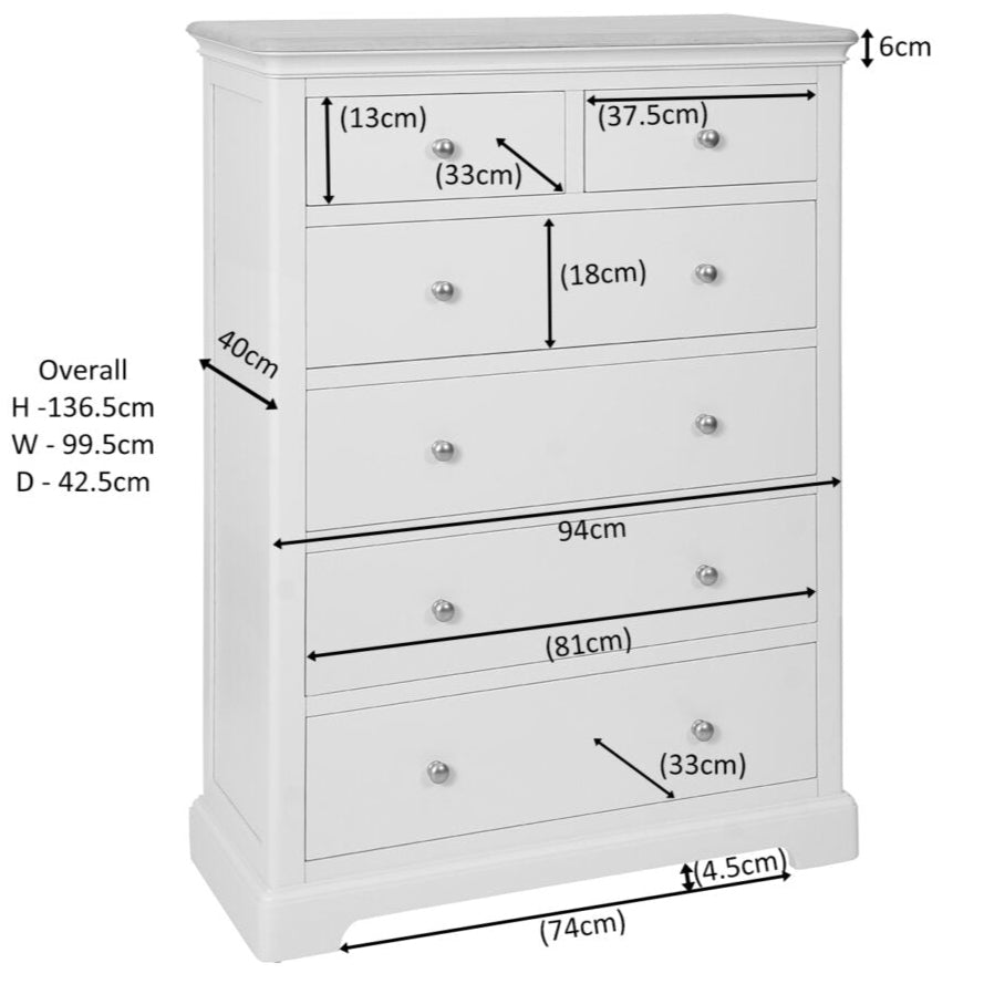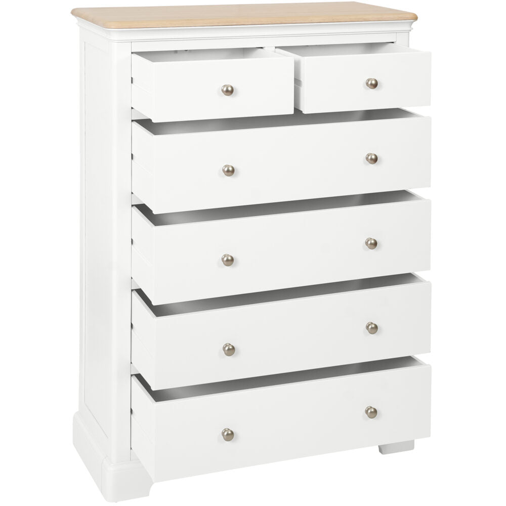 Enhance your bedroom with the timeless elegance of the Lyon 2 over 4 chest of drawers. Featuring exquisite mouldings and a durable paint finish, this piece exudes quality and charm. Its solid oak tops and spacious design offer both practicality and style. Elevate your space with this beautiful and functional addition.