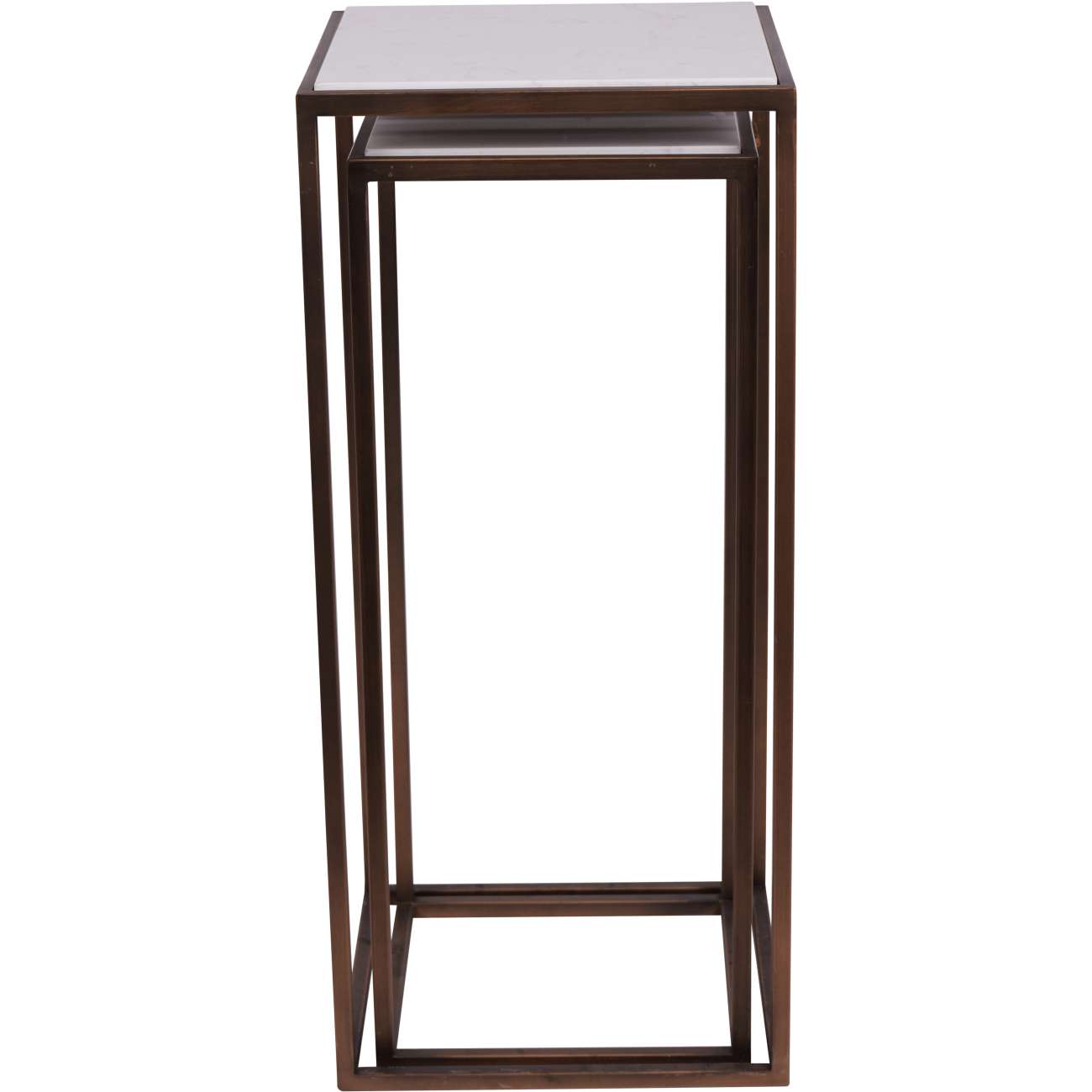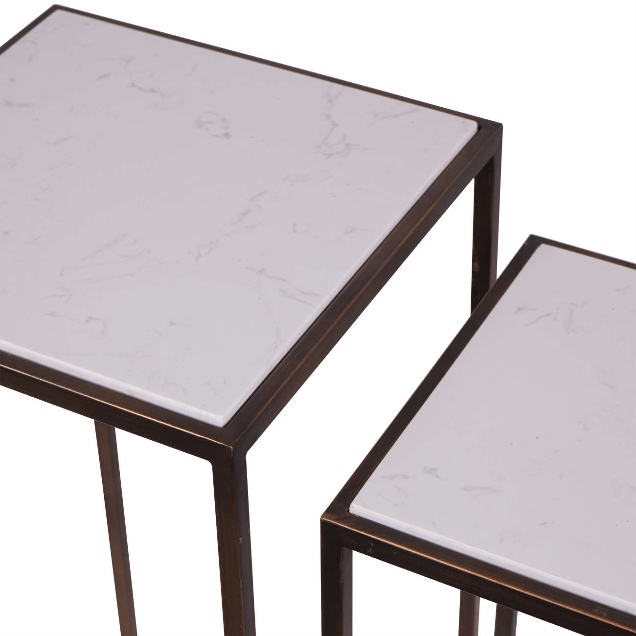 The Hylas set of two side tables, each crafted with meticulous attention to detail, are a perfect blend of functionality and artistic expression. At the heart of this set lies the majestic antique copper frame, imbuing each piece with a sense of strength and elegance. The frames cradle Ceramic tops finished in a delicate but effective marble effect. This luxurious combination of materials and finishes creates a mesmerising visual impact, with each table exuding its own unique charm. The tables are square in shape, offering a contemporary twist on classic design. They are thoughtfully designed to nest together, optimising space while adding an extra layer of versatility to their use.