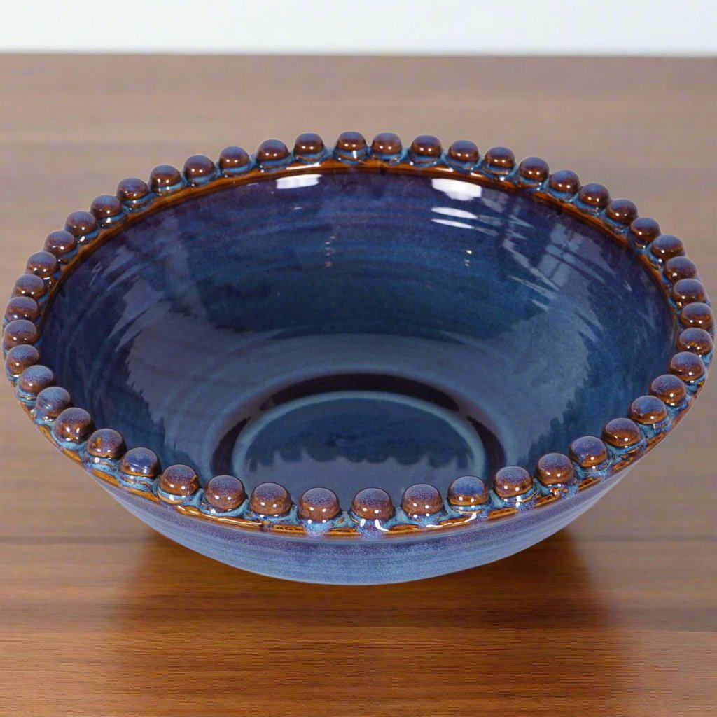 Introducing our Mediterranean Blue Reactive Glaze Ceramic Bowl, showcasing a stunning blue hue with delicate round ceramic beading. The enchanting reactive glazing infuses the beads with a shimmering blend of blue and brown tones, creating an air of understated luxury.
