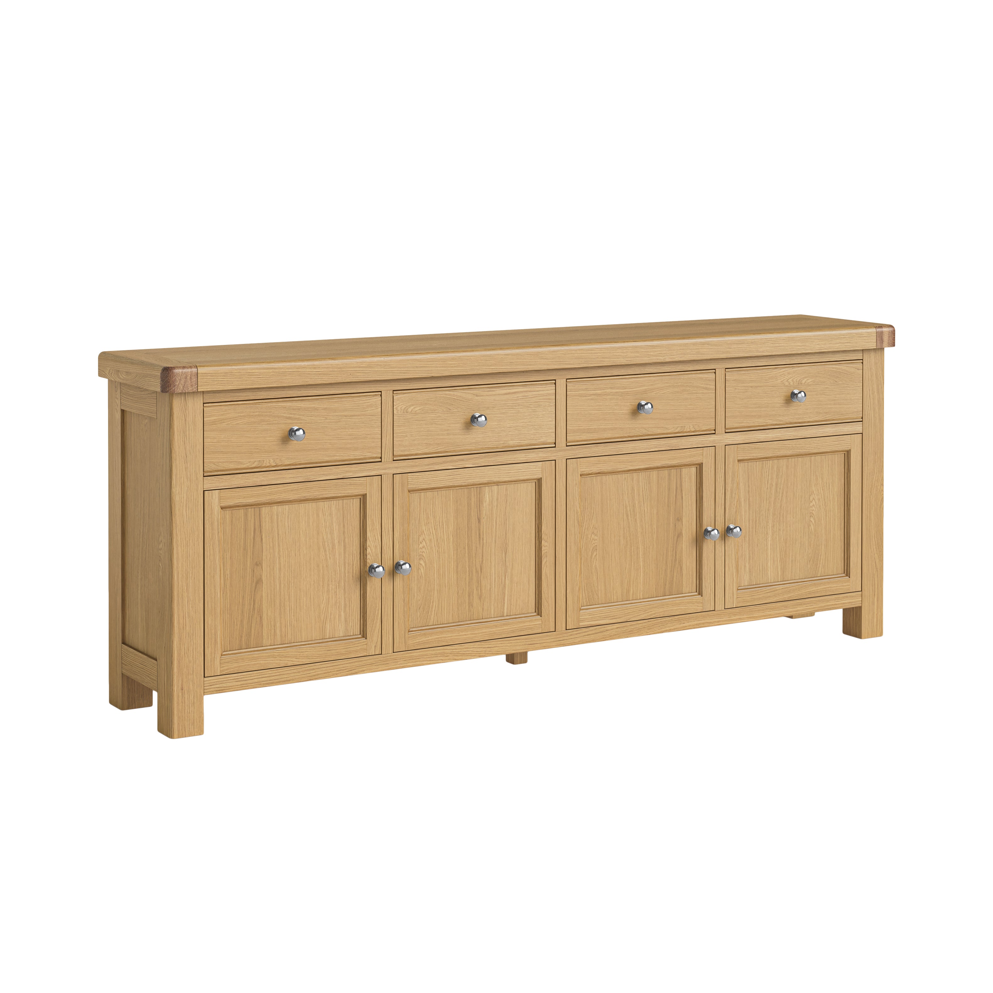 The Tokyo Large Sideboard combines timeless design with practical storage solutions. Constructed from solid oak frames and finished with genuine oak veneers, this piece delivers authentic wood craftsmanship and durability. Its generous proportions make it ideal for dining rooms or living spaces where you need substantial storage without compromising on style. The warm oak tones bring natural elegance to any interior, whilst the solid construction ensures this sideboard will remain a focal point for years to come. A versatile investment piece that balances form and function.