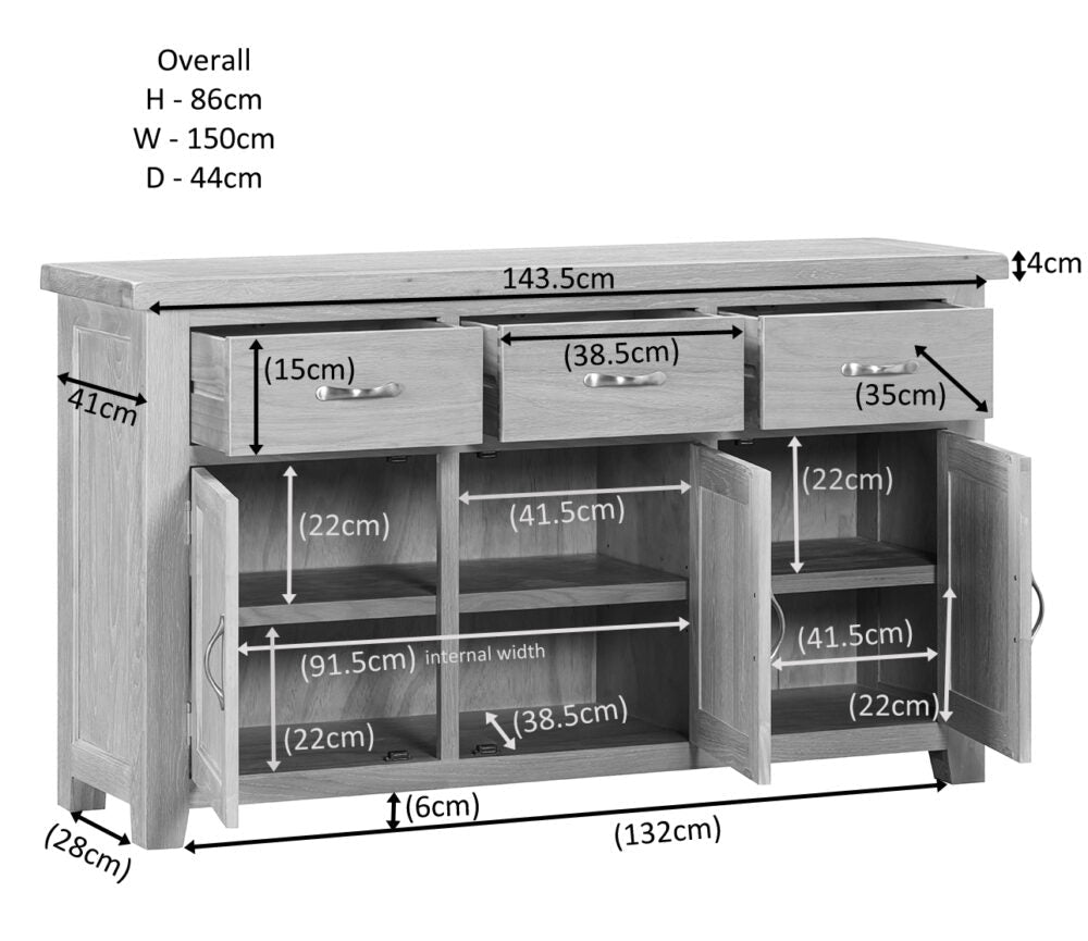This large impressive sideboard will add lots of essential storage to your home, ideally placed in a dining room, hallway or living room. This sideboard, with its contemporary handles and three single drawers above a double and single cupboard with adjustable shelves, gives your living area an ultra-modern, airy feel.