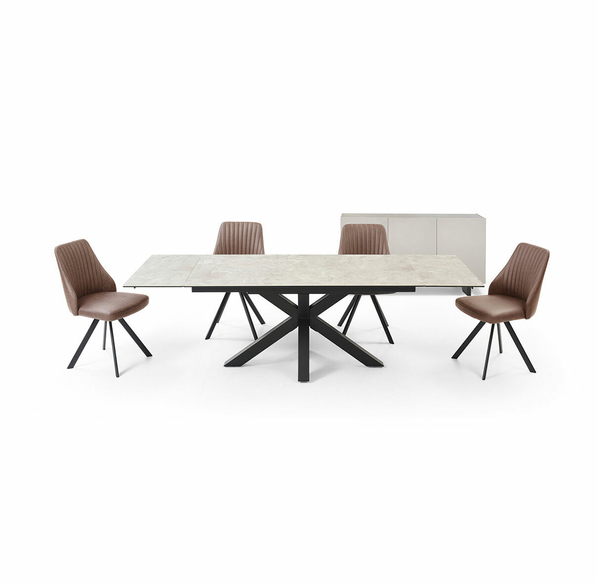 This chair really has it all in its versatility, clean contemporary lines, attractive ribbed details, and a fully cushioned seat and back upholstered in a brown faux bison upholstery. It features a swivel mechanism with return making it easy to keep up with the conversation around your dining table. The legs are finished in a smart black powder coat.