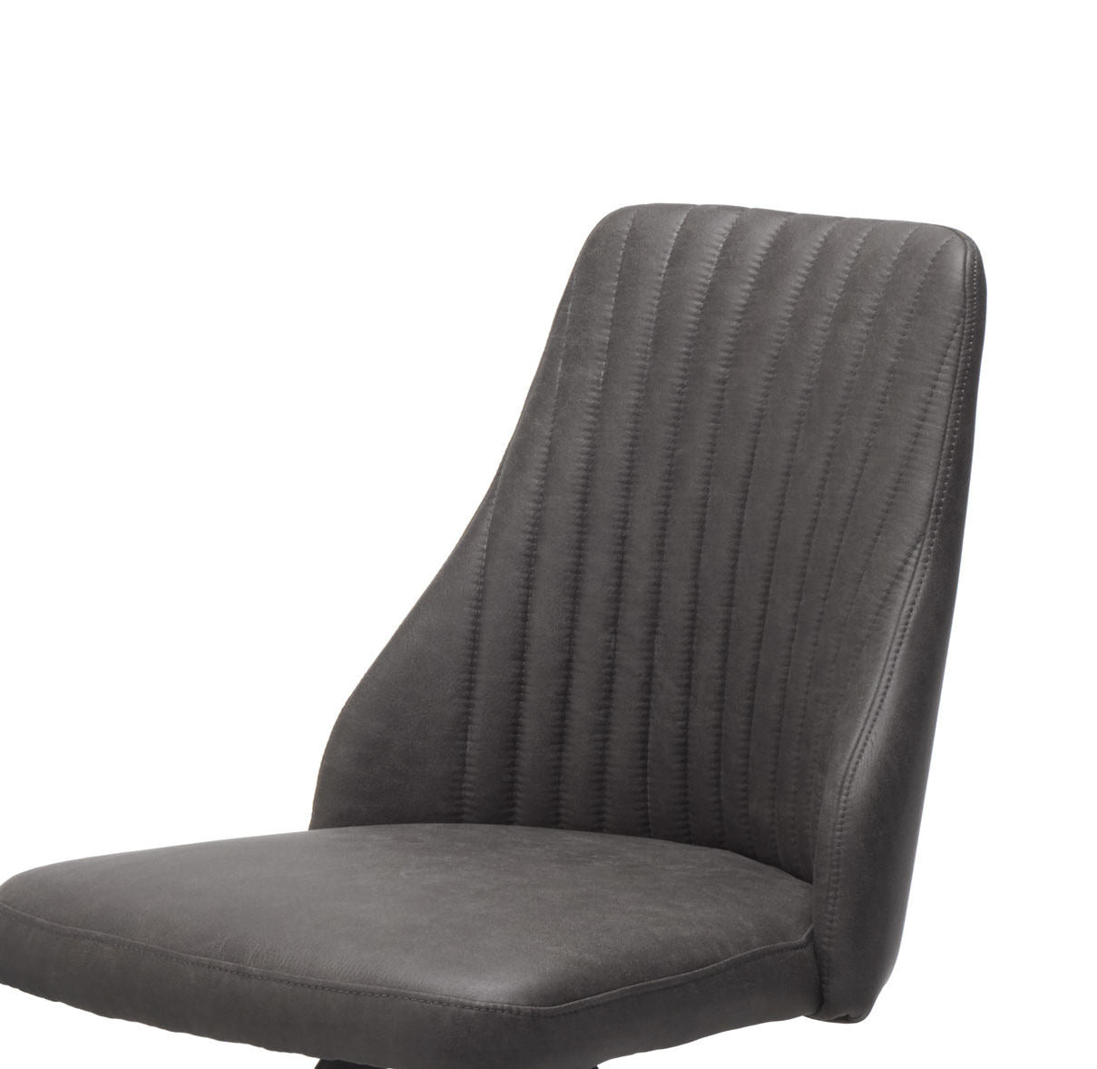 This chair really has it all in its versatility, clean contemporary lines, attractive ribbed details, and a fully cushioned seat and back upholstered in a brown faux bison upholstery. It features a swivel mechanism with return making it easy to keep up with the conversation around your dining table. The legs are finished in a smart black powder coat.