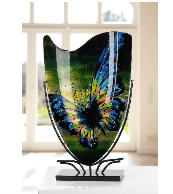 This exquisite hand-crafted glass vase showcases delicate butterfly motifs rendered through meticulous hand-painting techniques. Each piece is a unique work of artisanal craftsmanship, featuring vibrant detailing that captures the natural elegance of these winged creatures. The refined design makes it an ideal focal point for any interior space, whether displayed on a mantelpiece, shelf, or table. Perfect for those who appreciate fine decorative art and bespoke home furnishings that elevate everyday spaces with sophistication and character.