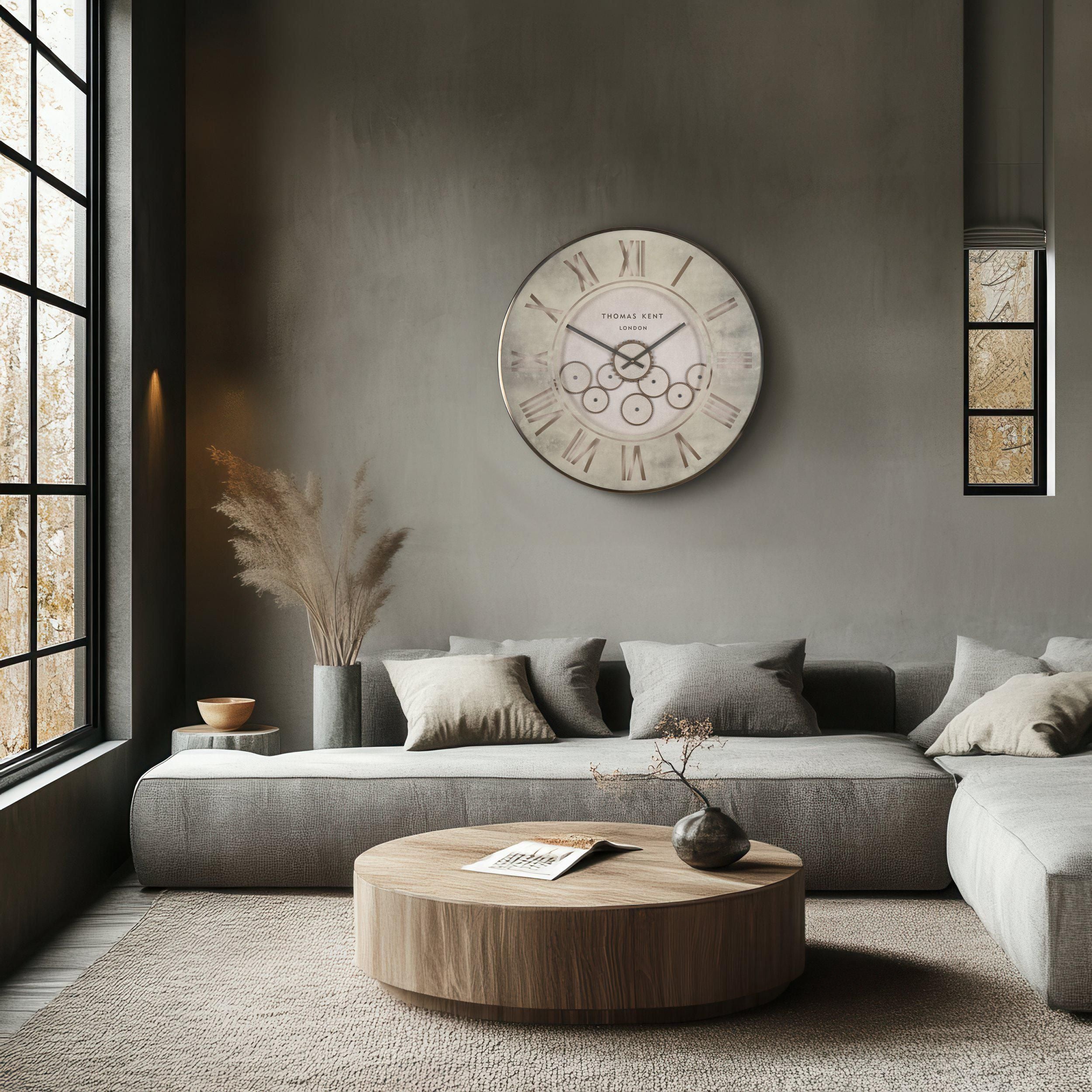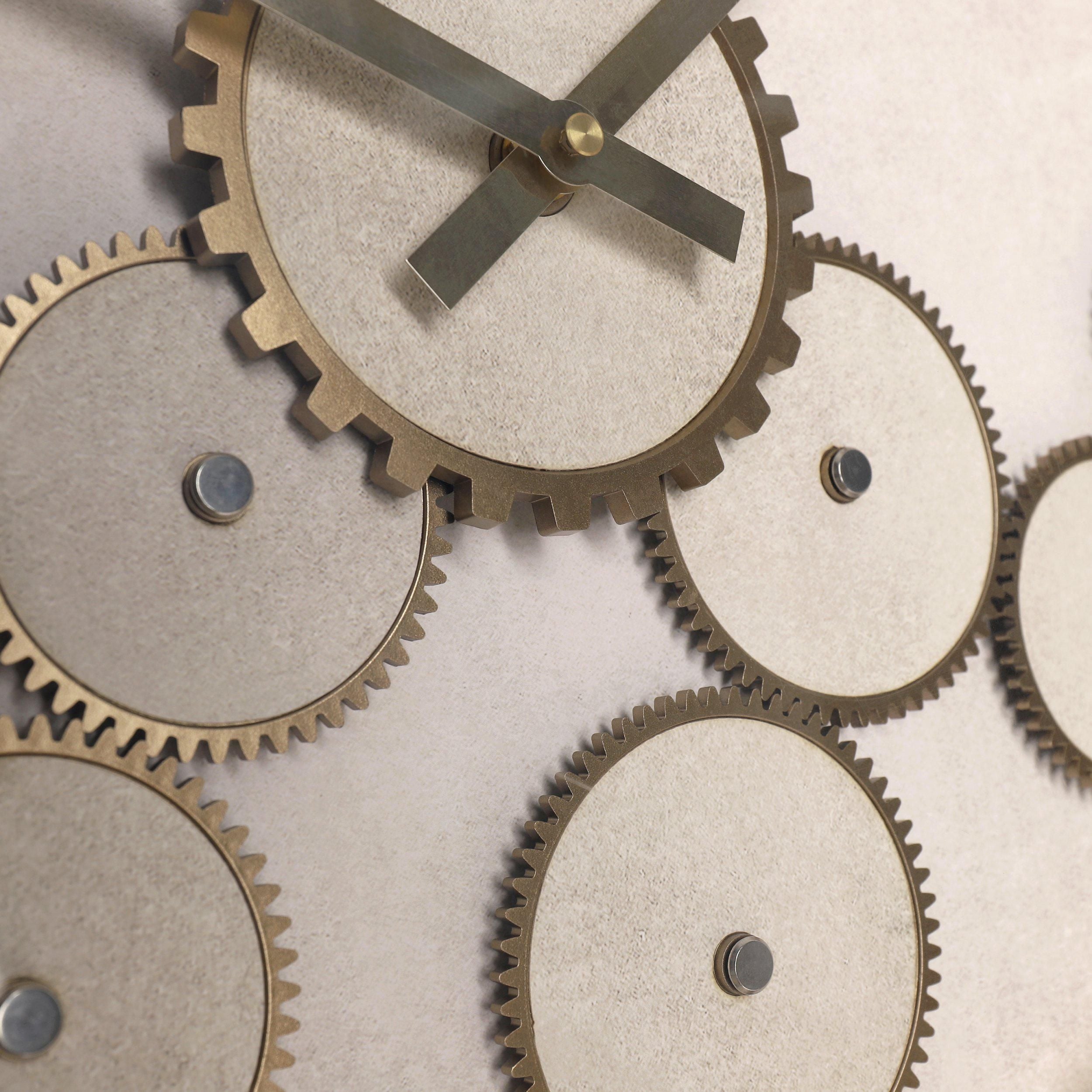 An impressive clock design with motion that radiates opulence by embracing stunning champagne hues.; Experience the captivating movement of stone-effect cogs with taupe teeth, creating a fabulous feature in an interior. The antique gold frame, holding a stone-effect glass lens, features contemporary Roman numerals, merging timeless beauty with modern inspiration. A pair of muted brown hands ground this decorative timepiece.