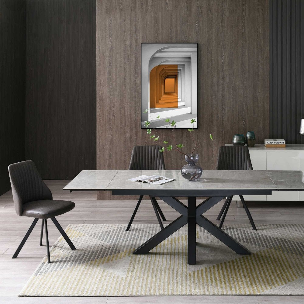 Introducing the Ceramic Extending Dining Table, featuring a sleek ceramic marble effect surface and a simple extending mechanism to accommodate up to ten guests. The durable construction makes it perfect for everyday use and the modern design will elevate any dining space.