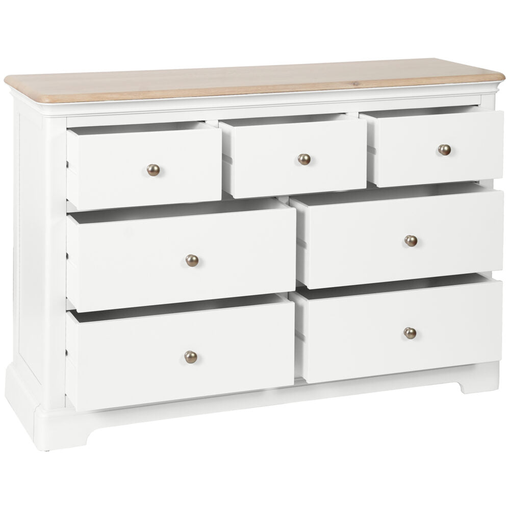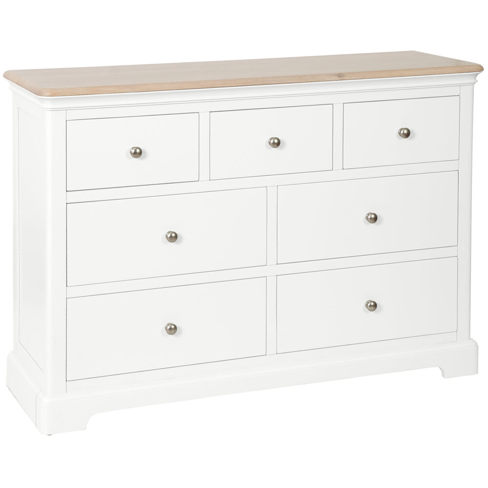 Enhance your bedroom with the timeless elegance of the Lyon 3 over 4 chest of drawers. Featuring exquisite mouldings and a durable paint finish, this piece exudes quality and charm. Its solid oak tops and spacious design offer both practicality and style. Elevate your space with this beautiful and functional addition.