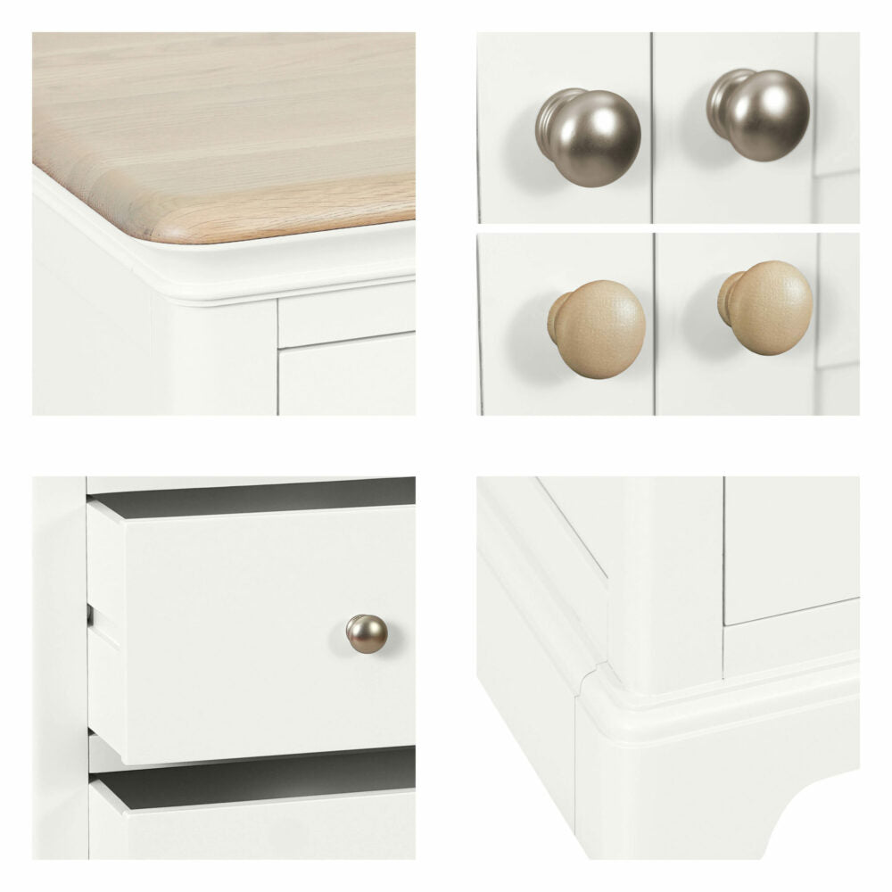 • Features: Solid oak top, dovetailed drawers, painted plinth, curved moulding
