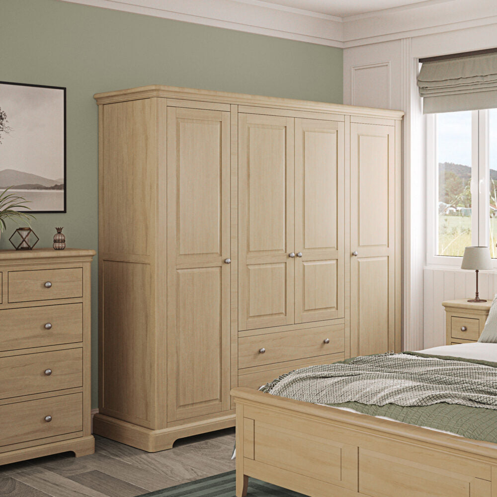 Our Quad wardrobe is the ultimate storage solution for your bedroom. Offering an impressive home for your clothes, shoes and bedding, this robe is sure to deliver on all your storage needs. Featuring two single full length hanging spaces, on either end of the robe, perfect for long garments, along with the option to install the handy second rail halfway down, to make hanging space for shorter clothing. You can also use the base of the robe to hold shoes or storage boxes. The middle 2 door section includes a full width hanging space above two large drawers with ample capacity for bedding, t-shirts or shoes. Featuring a sculptured plinth, delicately curved edges, a rounded top, and a light oak finish.