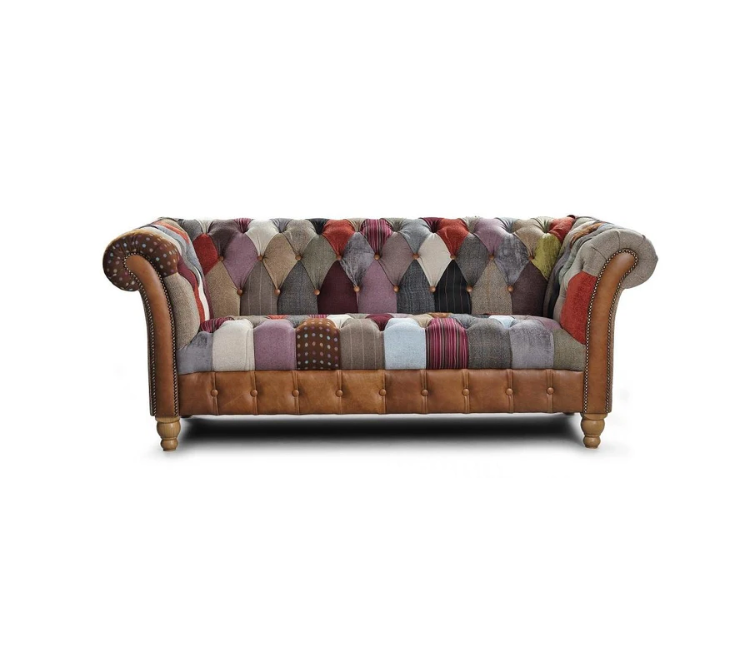 The Patchwork 2-seater sofa is a bold and elegant statement piece that combines traditional design with a modern twist. Handcrafted with a deep button-tufted backrest and rolled arms, this unique sofa features a patchwork upholstery of various fabrics and colours for a vibrant and eclectic look. Accented with nailhead trim and supported by turned wooden legs, it exudes charm and sophistication while providing comfortable seating. Elevate your living space and make a stylish impact with this one-of-a-kind patchwork sofa.