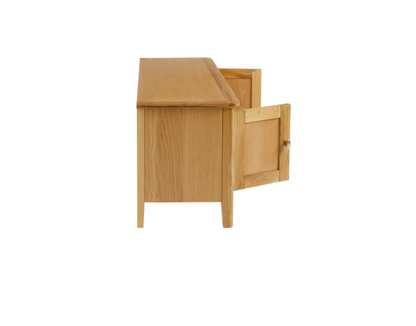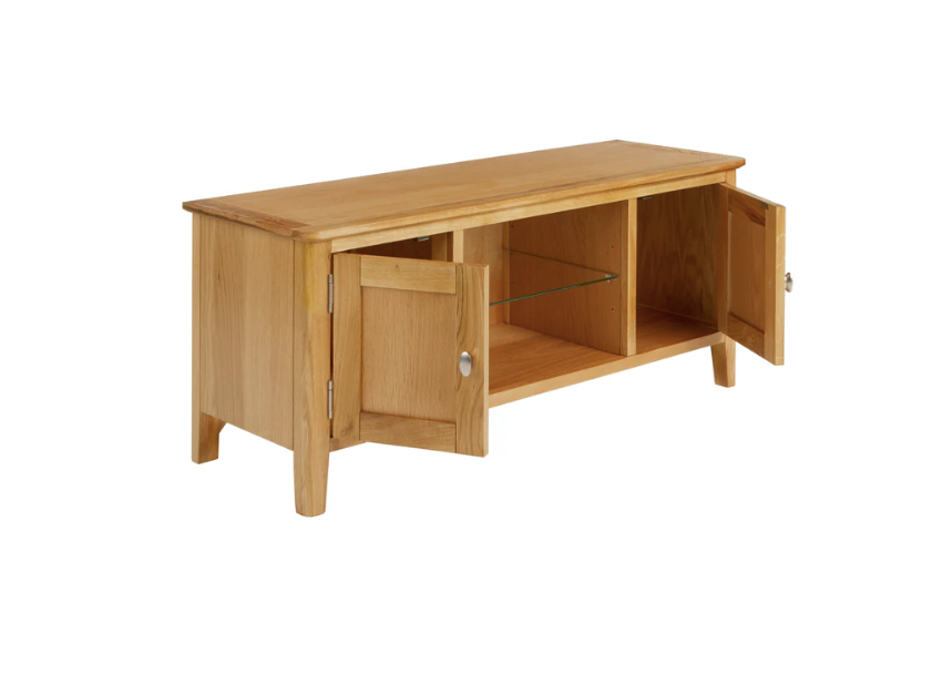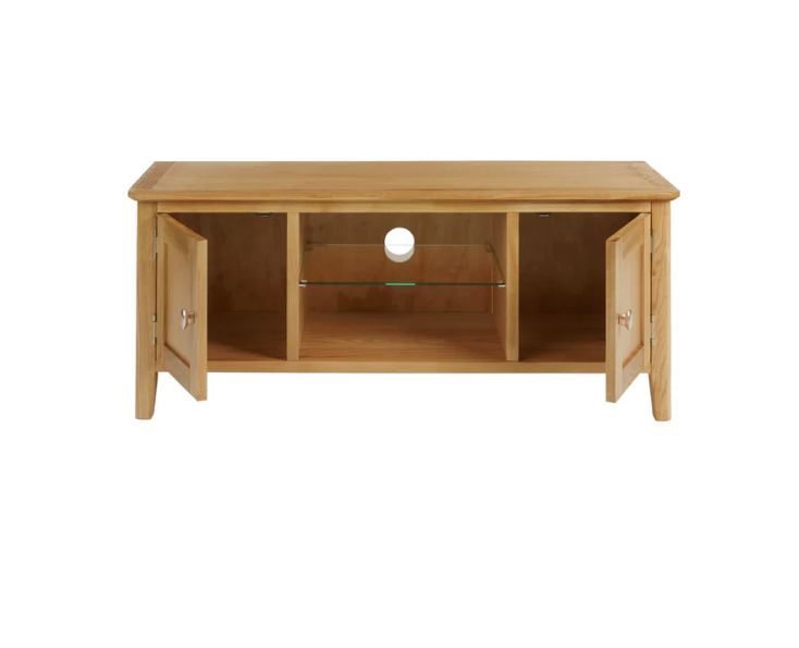 Crafted for elegance and functionality, our relaxed modern oak TV unit features a glass shelve and plenty of storage for all your media needs. Its clean lines and gentle curves exude a timeless charm, while the natural lacquer finish provides durability for years to come.