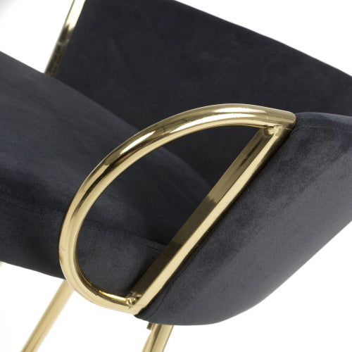 This lavish gold framed bar stool exudes quality. The snug comfortable seat is upholstered in a silky black brushed velvet. The circular backrest is crowned by D shaped gold handles, doubling as armrests and grips for entering and exiting the stool. An opulent tubular gold covered chrome frame supports the stool, secured by a handy square footrest.